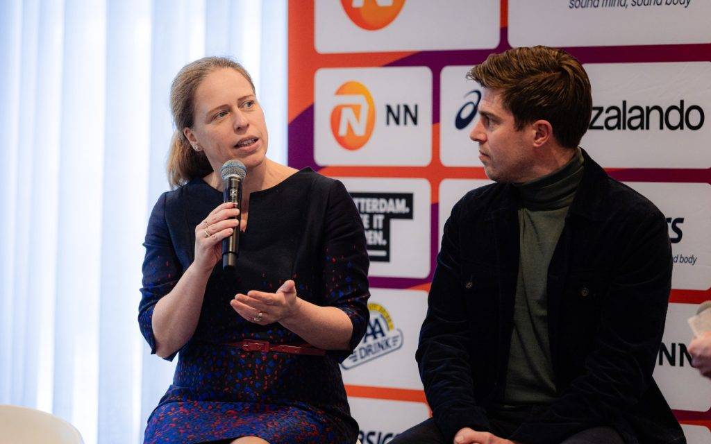 Voor burgemeester Carola Schouten wordt het haar tweede NN Marathon Rotterdam in functie. Op het podium in het Hilton Hotel steekt ze haar waardering voor de atleten niet onder stoelen of banken: “Ik heb buitengewoon veel respect voor wat ze doen en hoe ze dat doen.”